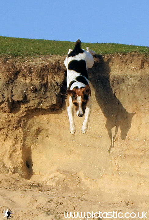 Jack Russell Terrier Penny taking a leap of faith amongst the sand dunes in Cornwall
